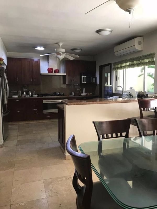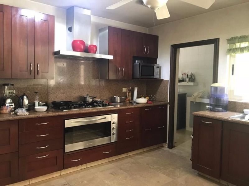 En el Primer piso está la sala, el comedor, la cocina de granito con antecomedor, biblioteca, cuarto de juegos y tv, cuarto de servicio con baño y lavandería, jardín con terraza y alberca,