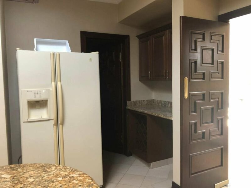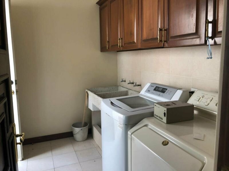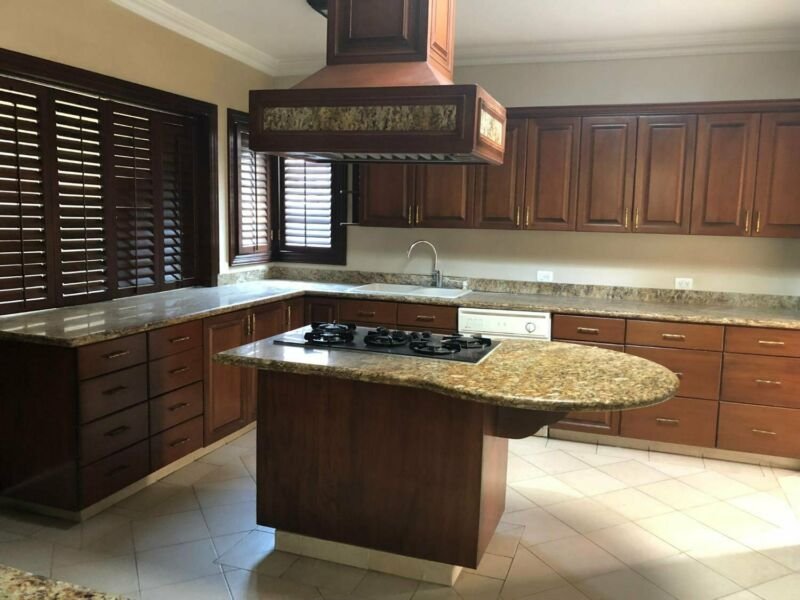 Primer nivel: cuarto de TV con librero y vista al parque, cocina muy amplia con cubierta de granito, despensa grande, cava, lavandería y salida a pasillo lateral. Sala comedor muy grande, medio baño, patio con barra de granito y fuente.