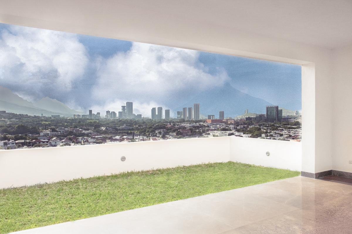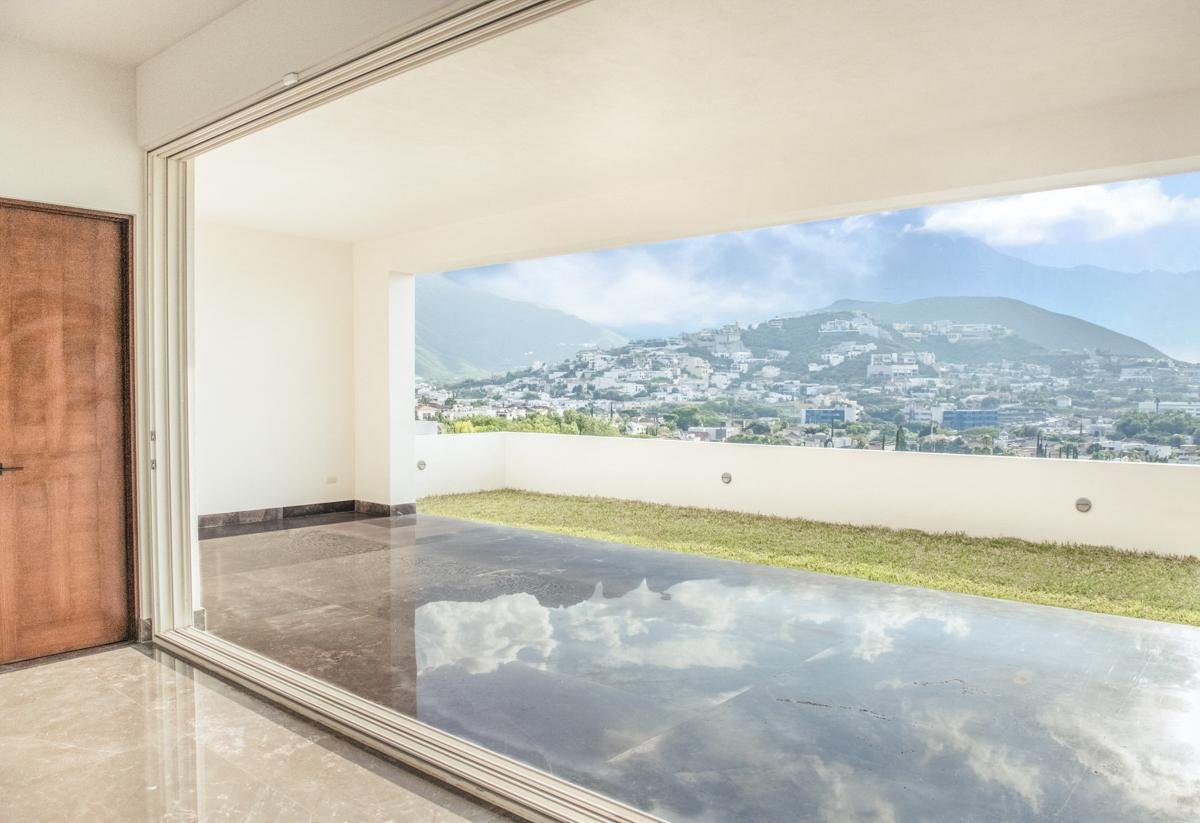 Residencia nueva de estilo contemporáneo en zona apartada y tranquila, con sorprendentes vistas sobre San Pedro, en la colonia Balcones del Campestre. Bonita fachada con detalles de Galarza que luce una elegante puerta de parota diseñada a la medida y que da la bienvenida a un espacioso recibidor abierto hacia toda el área social con hermosos pisos de mármol negro. Sus grandes ventanas panorámicas le dan a la casa muy buena iluminación y vistas increíbles de día y noche. Con 524 m2 de construcción, esta casa de tres plantas está erguida en un terreno descendente de 325 m2, teniendo la entrada convenientemente ubicada en la segunda, por lo que solo subirás un nivel para desplazarte a las recámaras o bajarás uno para dar servicio desde la cocina al salón de juegos. La cocina, por cierto, se encuentra en obra blanca, así que podrás diseñarla a tu gusto y de acuerdo a tus necesidades. Su uso será versátil ya que se una a la estancia familiar que tiene la opción de separarse o integrarse a la sala comedor. Esta casa goza de 3 recámaras, cada una con su baño y vestidor; y con finos acabados, con puertas interiores de madera de encino y baños con placas de mármol con lavabos sobrepuestos. Además el salón de juegos, ubicado en la planta baja, tiene también un baño completo y un ventanal que se abre completo hacia la terraza y el jardín. La ubicación y la seguridad siempre son importantes y la casa cuenta con sistema de alarma en un fraccionamiento con caseta de vigilancia 24/7 y con rápido acceso a los mejores colegios , hospitales y centros comerciales. Otros aspectos que hacen que esta casa sea funcional y cómoda son el cuarto de servicio amplio, la bodega , estacionamiento para tres carros, puerta de acceso familiar, pasillo lateral y preparación para asador y/o bar, cisterna Rotoplast, 2 climas Fan and Coil de 4 toneladas cada uno, y adicionalmente minisplits en todas las recámaras y en la sala de juegos.