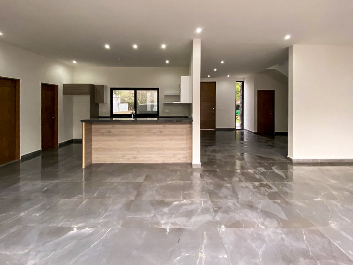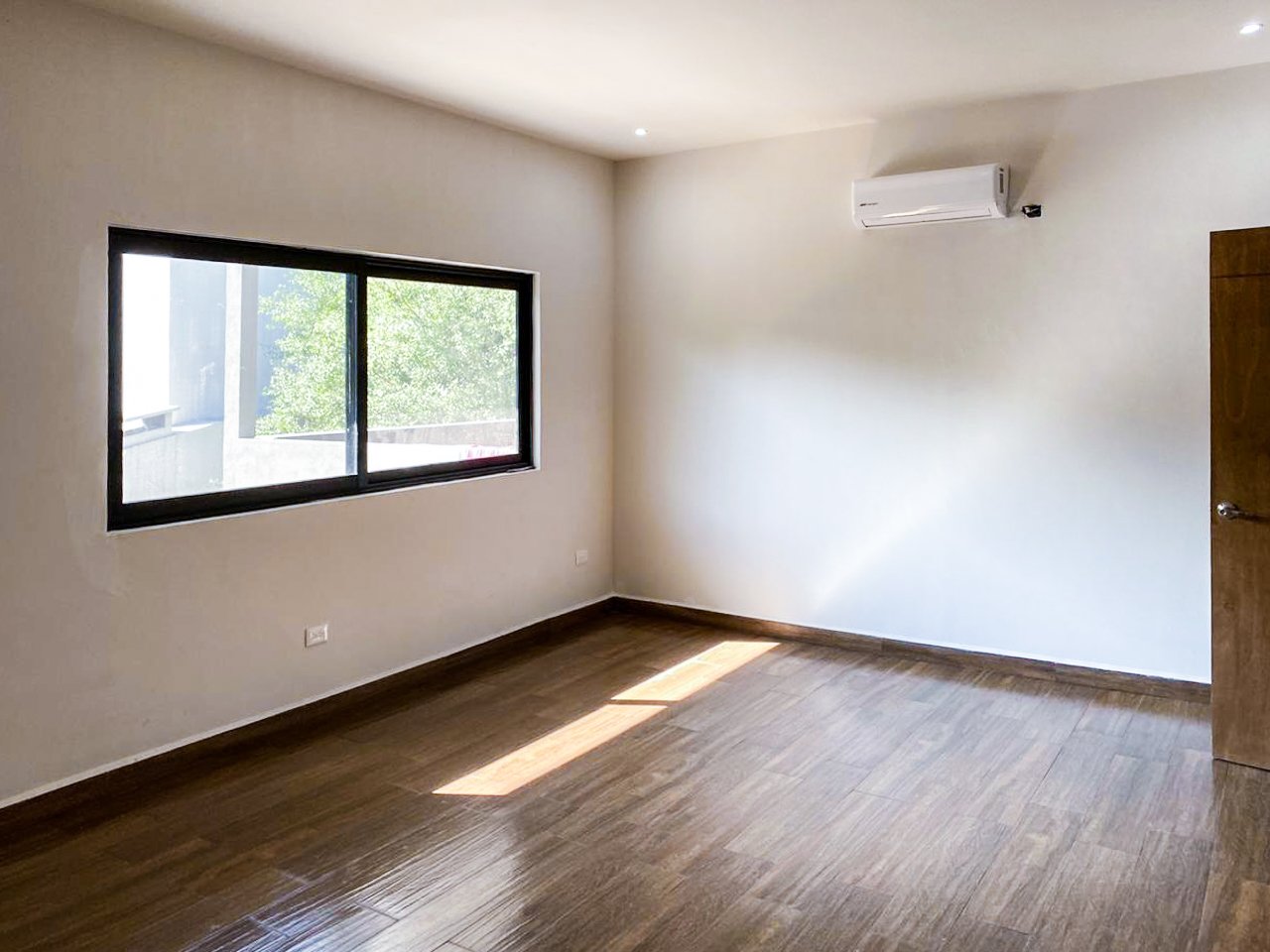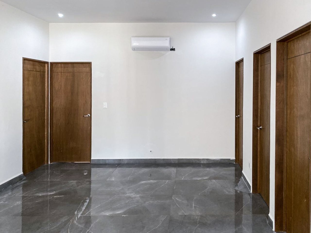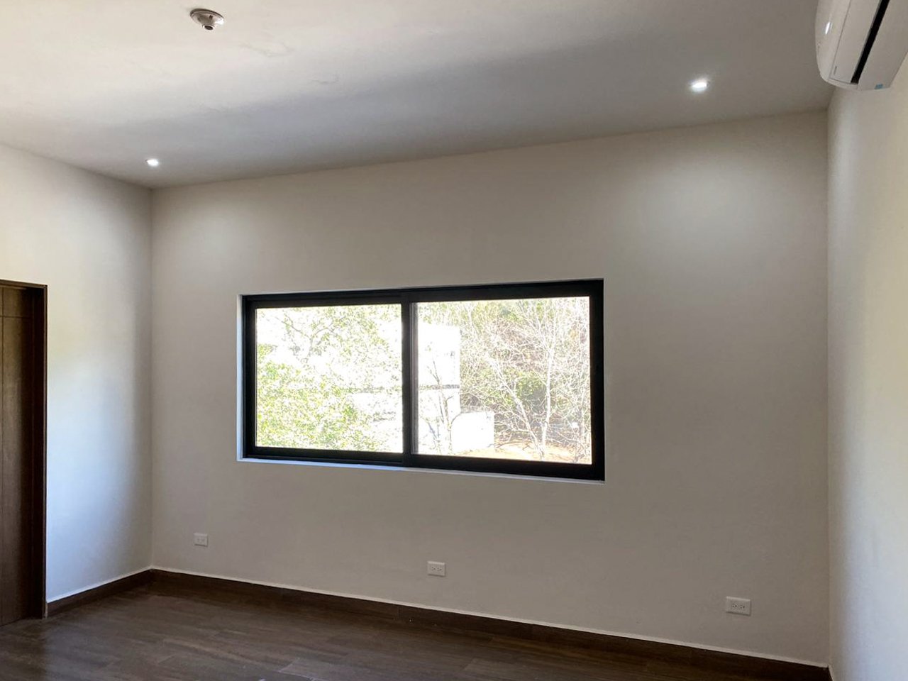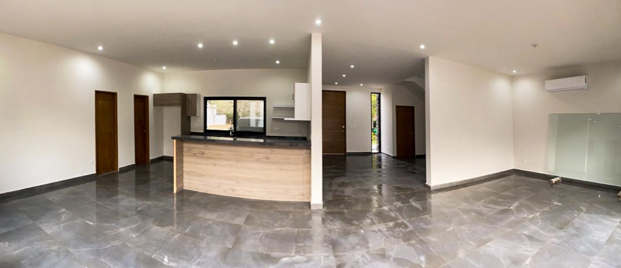 También cuenta con sala-comedor,recámara principal con terraza techada, baño y vestidor, dos recámaras para niños con baño y vestidor, sala de TV, oficina, lavabos con lavanetas y cubiertas de mármol,clósets, minisplits, canceles de baño y pasamanos de cristal, ventanas Duo Vent, estufa de parrilla, lavandería,cuarto de servicio, bodega en planta baja.