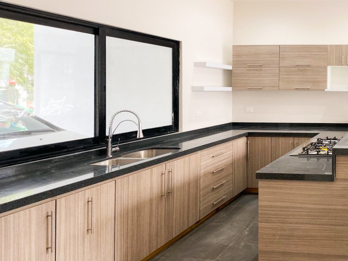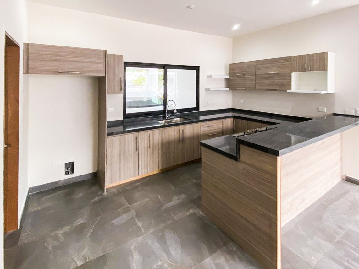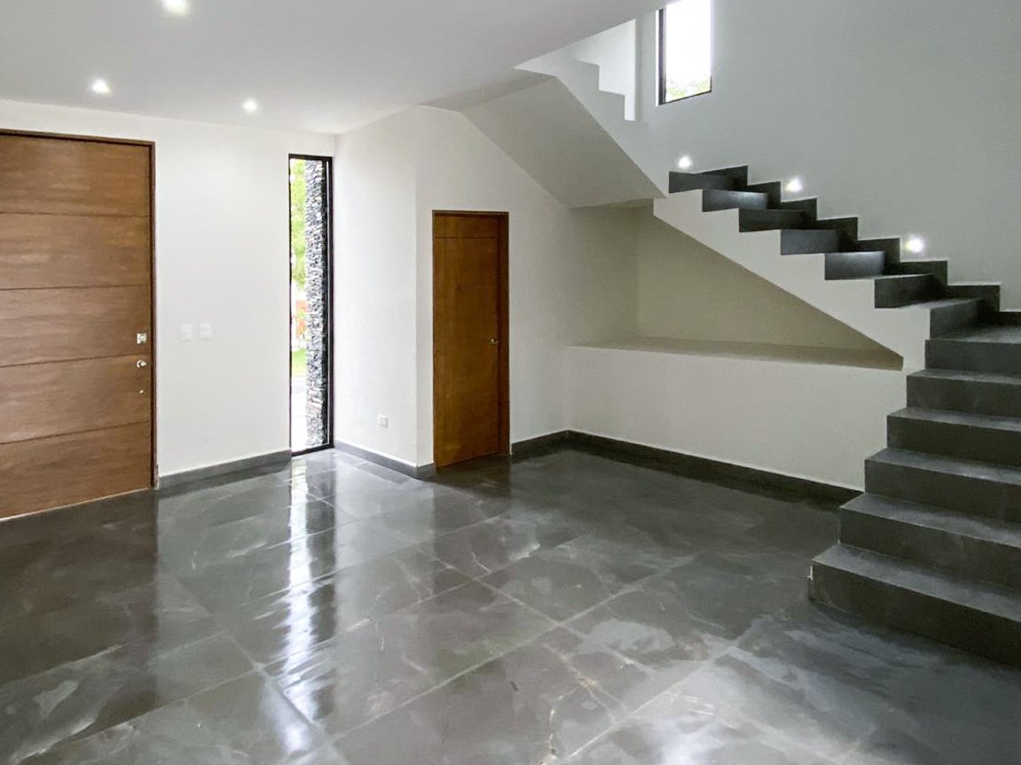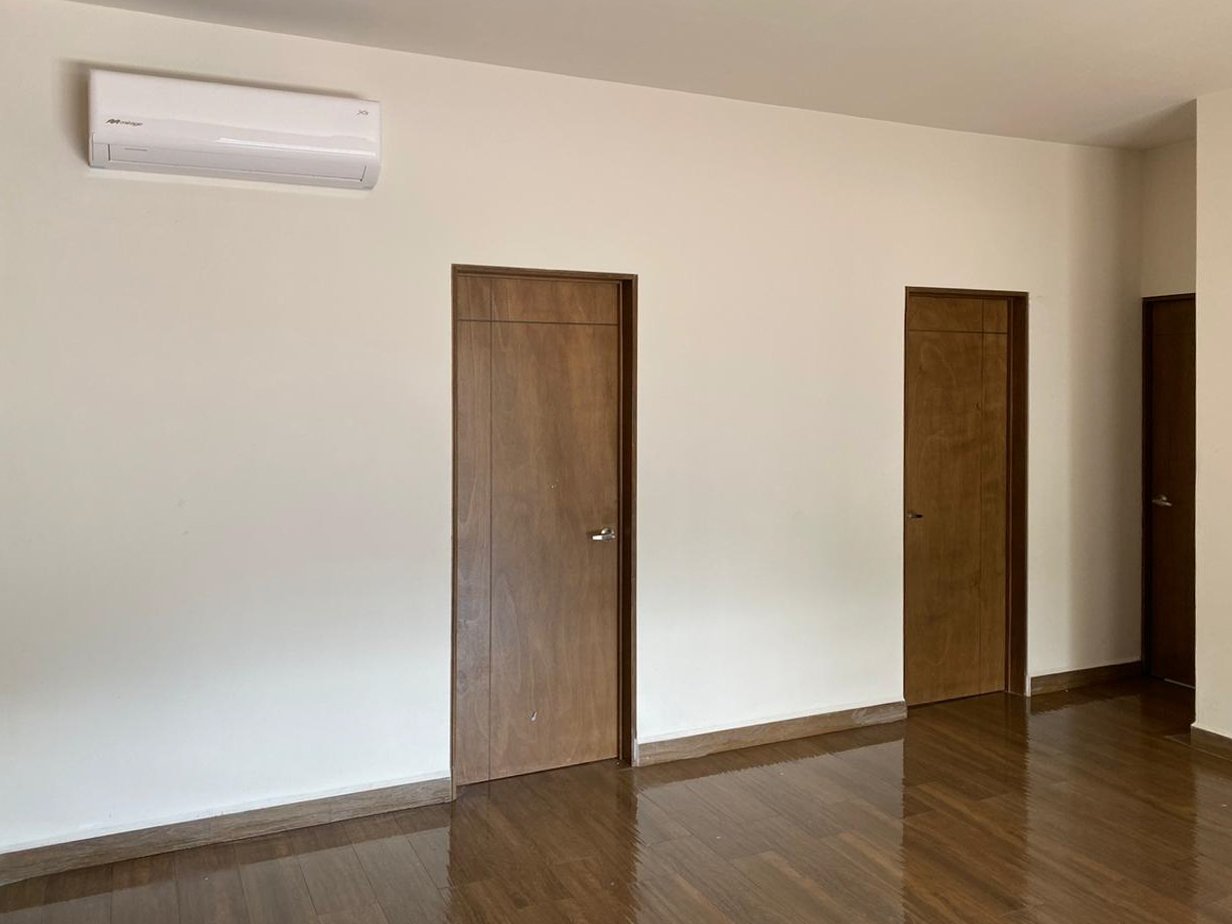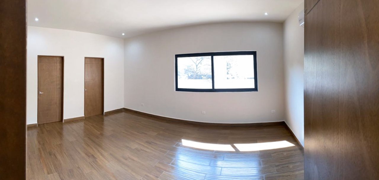 También cuenta con sala-comedor,recámara principal con terraza techada, baño y vestidor, dos recámaras para niños con baño y vestidor, sala de TV, oficina, lavabos con lavanetas y cubiertas de mármol,clósets, minisplits, canceles de baño y pasamanos de cristal, ventanas Duo Vent, estufa de parrilla, lavandería,cuarto de servicio, bodega en planta baja.