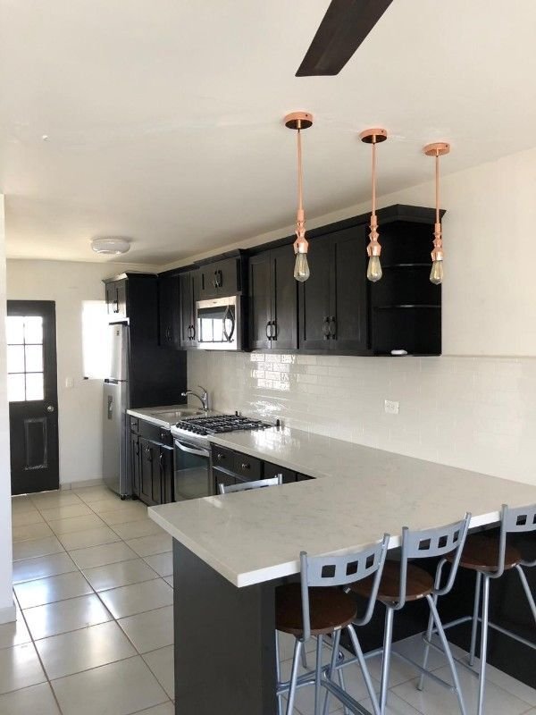 Venta incluye cocina integral con cubierta de granito, estufa, microondas, refrigerador, boiler de agua, persianas zebra, closets en dos recamaras, bancos para barra, abanicos, papel tapiz en recamara principal y piso laminado en pared de la sala.