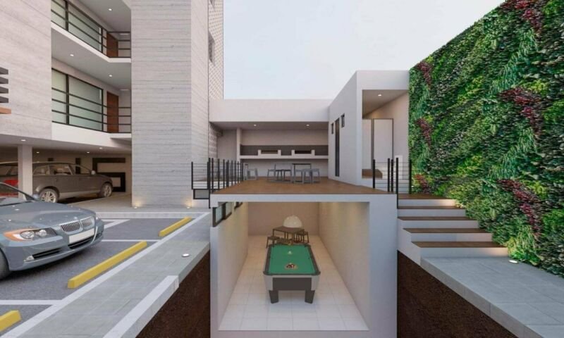 Cuarto de lavandería 1Cajón para estacionamiento Departamento 105 m2 Sala comedor Cocina 3 recámaras 1 estancia para TV 2 baños completos Cuarto de lavandería 2 Cajones de estacionamiento